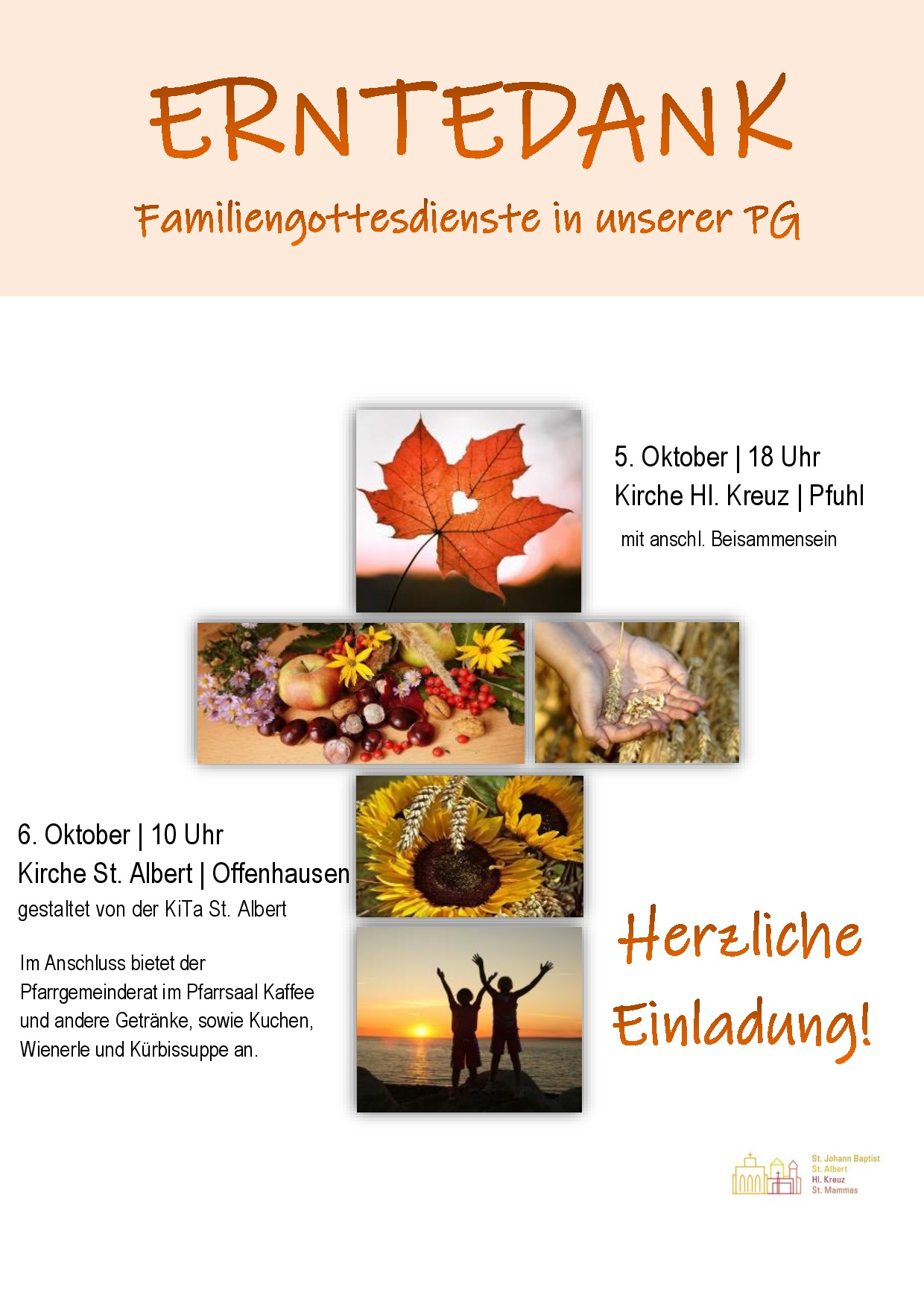 Familiengottesdienst zu Erntedank in Pfuhl Wann Sa.. 05.10.2024 18:00 – 19:00 Zum Kalender hinzufügen ICS herunterladen Google Kalender iCalendar Office 365 Outlook Live Wo Hl. Kreuz Platzgasse 14, Neu-Ulm/Pfuhl, 89233