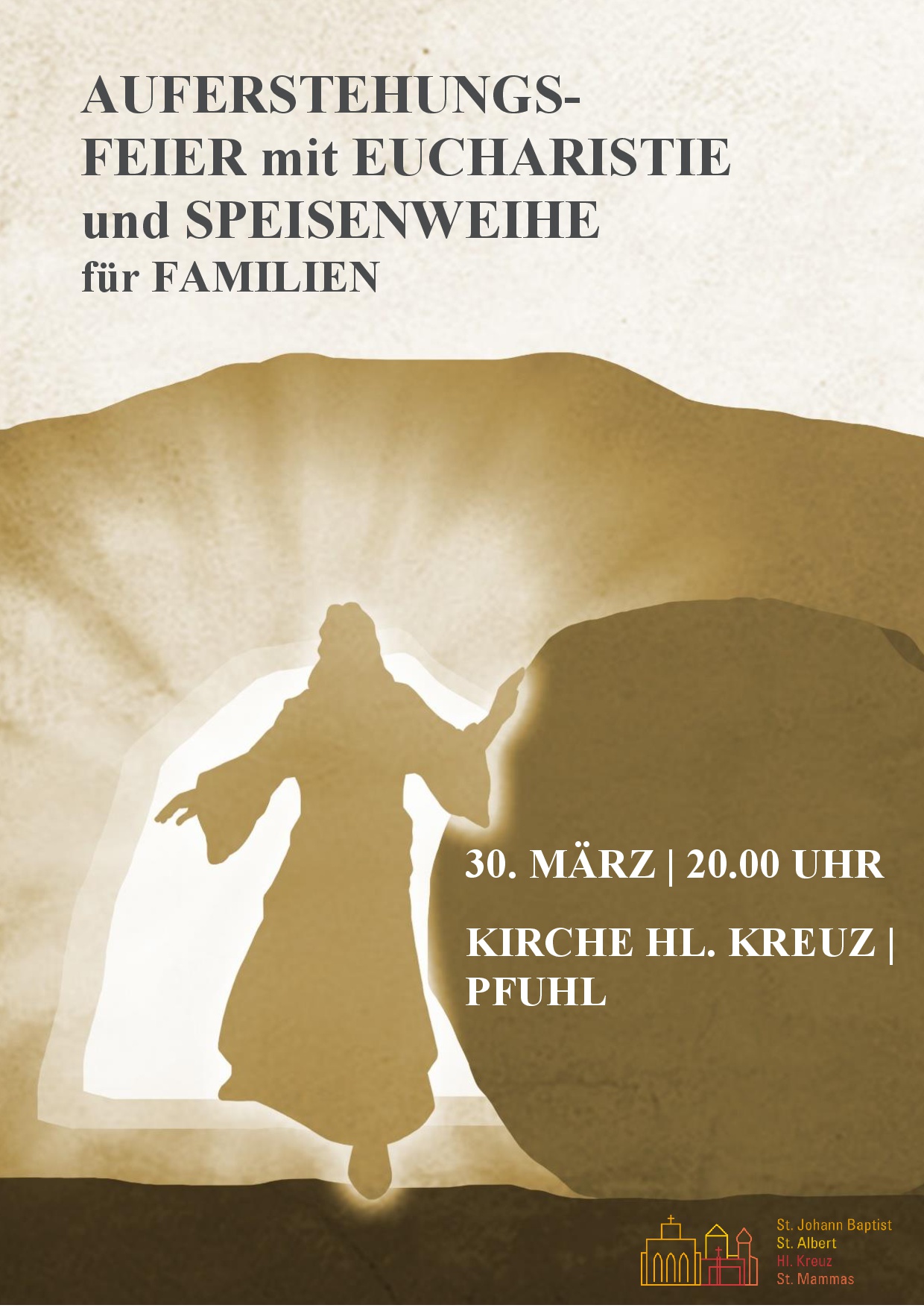 Auferstehungsfeier mit Eucharistie und Speisenweihe für Familien Wann Sa.. 30.03.2024 20:00 – 21:30 Zum Kalender hinzufügen ICS herunterladen Google Kalender iCalendar Office 365 Outlook Live Wo St. Johann Baptist Johannesplatz 1, Neu-Ulm, Bayern, 89231