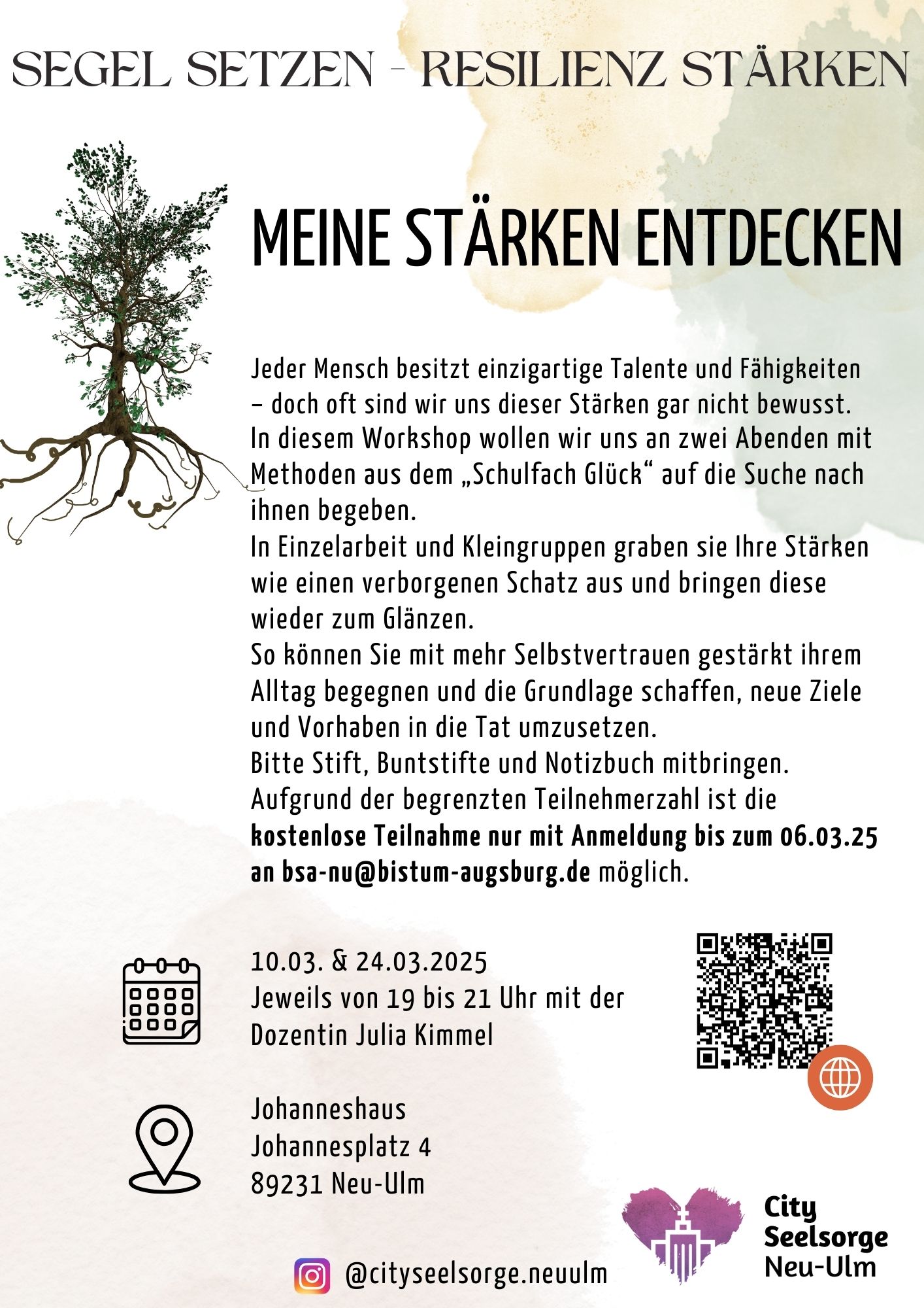 Cityseelsorge: Meine Stärken entdecken – bitte anmelden Wann Mo.. 10.03.2025 19:00 – 21:00 Zum Kalender hinzufügen ICS herunterladen Google Kalender iCalendar Office 365 Outlook Live Wo Johanneshaus Johannesplatz 4, Neu-Ulm, Bayern, 89231