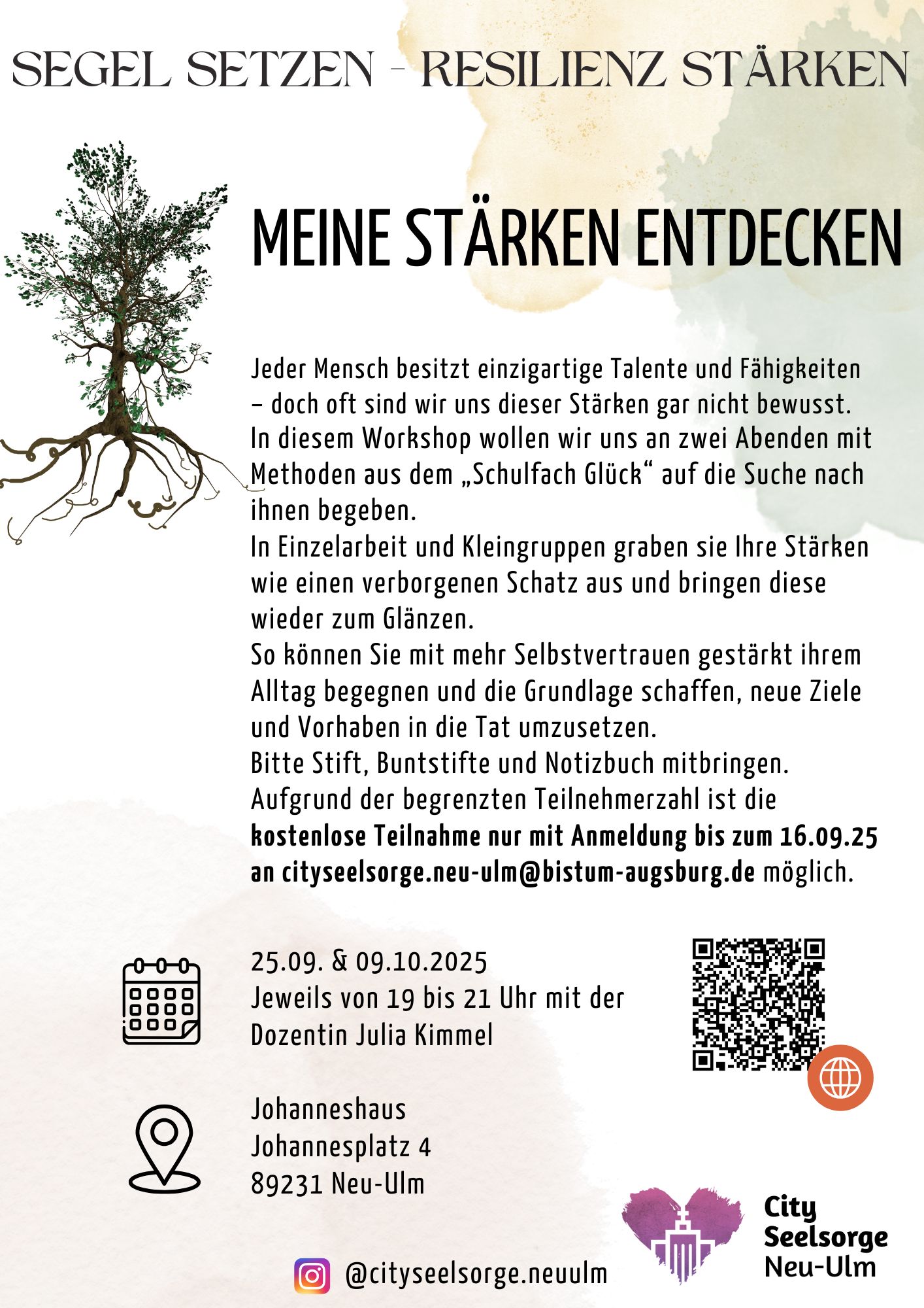 Cityseelsorge NU: Meine Stärken entdecken Teil 2 – bitte anmelden Wann Do.. 09.10.2025 19:00 – 21:00 Zum Kalender hinzufügen ICS herunterladen Google Kalender iCalendar Office 365 Outlook Live Wo Johanneshaus Johannesplatz 4, Neu-Ulm, Bayern, 89231