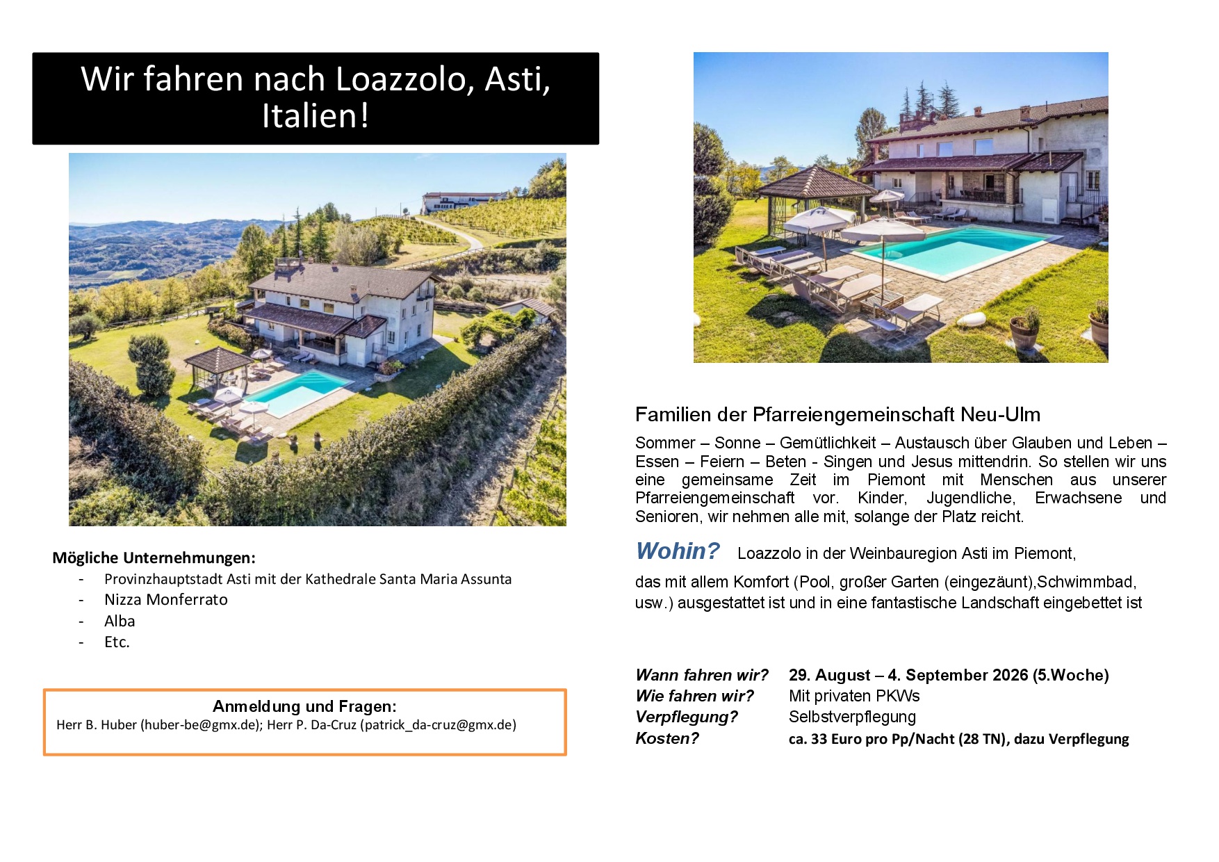 Familienfreizeit der PG Neu-Ulm in Italien Wann Sa.. 29.08.2026 – Fr.. 04.09.2026 Ganztägig Zum Kalender hinzufügen ICS herunterladen Google Kalender iCalendar Office 365 Outlook Live