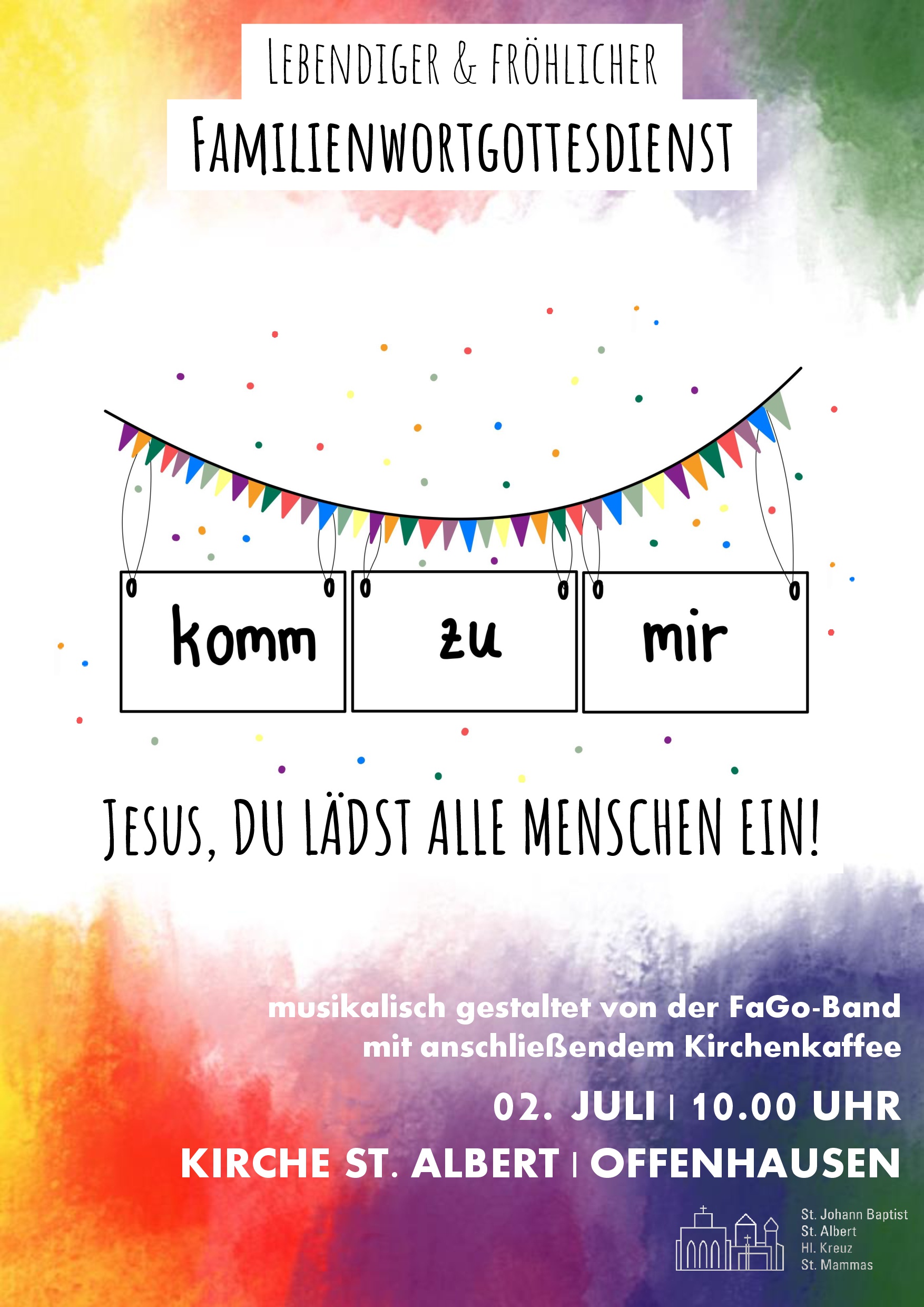 Endlich ist es wieder so weit. Am Sonntag, 2. Juli um 10 Uhr gibt es wieder einen Familienwortgottesdienst für Groß und Klein in St. Albert Offenhausen. Jesus lädt uns ein gemeinsam Gottesdienst zu feiern. Wir dürfen bei ihm Gäste sein. Jesus macht uns zu seinen Freunden. Wir wollen beten, tanzen, singen und darüber nachdenken, was uns die Freundschaft mit Jesus bedeutet. Musikalisch wird der Gottesdienst wieder von unserer wunderbaren FaGo-Band begleitet. 🎵🎵 Nach dem Gottesdienst laden wir zum gemütlichen Ausklang zum Kirchenkaffee ein. ☕ Herzliche Einladung!