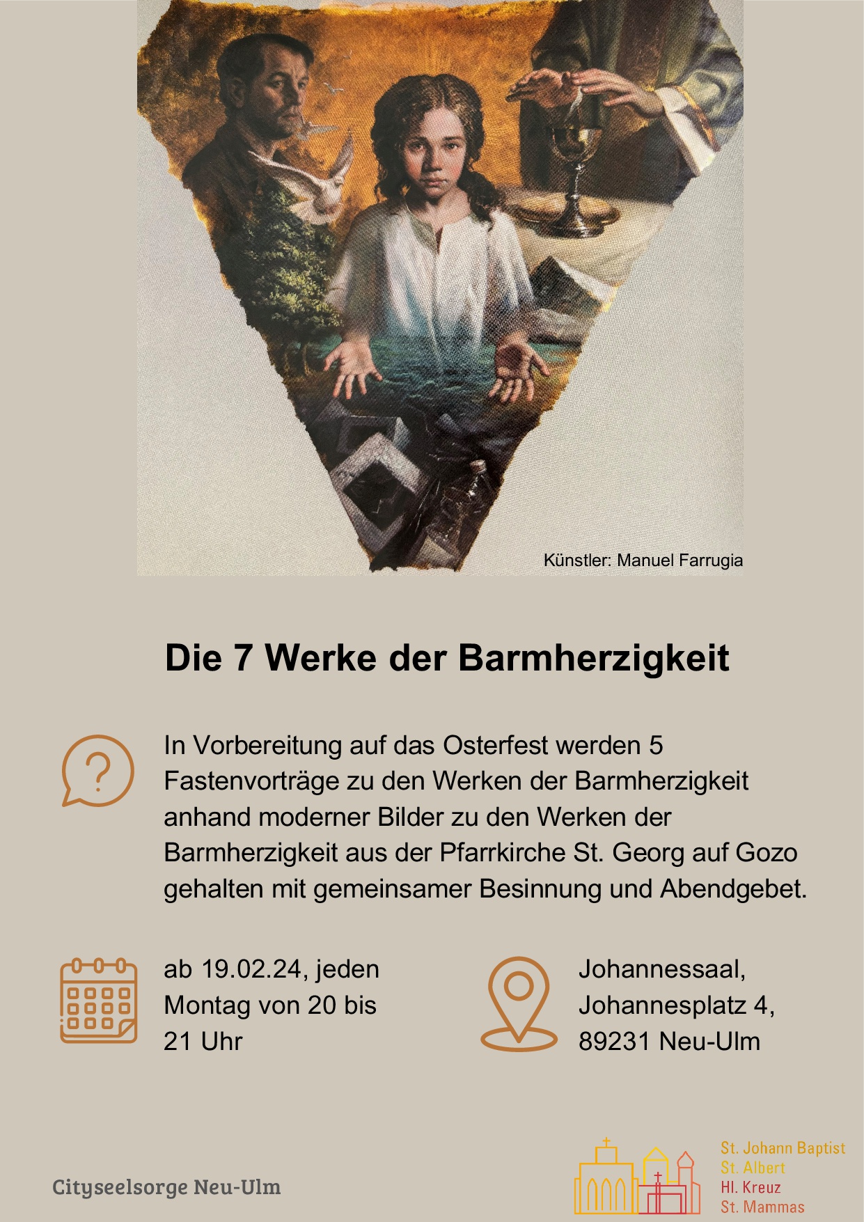 Wiederholt hat Papst Franziskus die Christenheit dazu aufgerufen, die Werke der Barmherzigkeit zu betrachten und sie tatkräftig zu leben. In dieser Fastenzeit bietet Pfarrer Klein 5 Vorträge zu den Werken der Barmherzigkeit an. Die Vorträge werden anhand moderner Bilder zu den Werken der Barmherzigkeit aus der Pfarrkirche St. Georg auf Gozo gehalten und beinhalten jweilis auch eine gemeinsame Besinnung und ein Abendgebet.