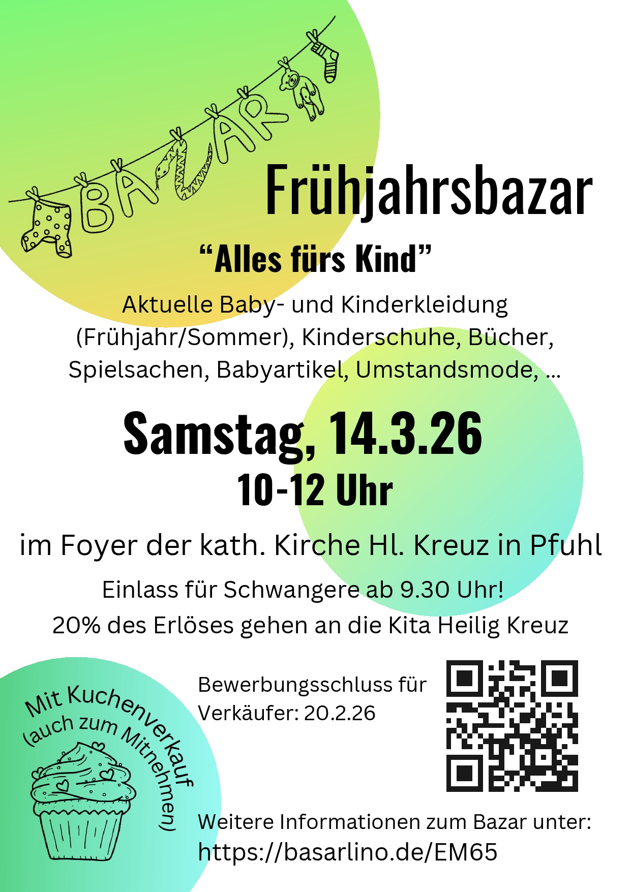 Frühjahrsbazar – Alles fürs Kind in Pfuhl Wann Sa.. 14.03.2026 10:00 – 12:00 Zum Kalender hinzufügen ICS herunterladen Google Kalender iCalendar Office 365 Outlook Live Wo Pfarrzentrum Heilig Kreuz Platzgasse 12, Neu-Ulm/Pfuhl, 89233, Bayern