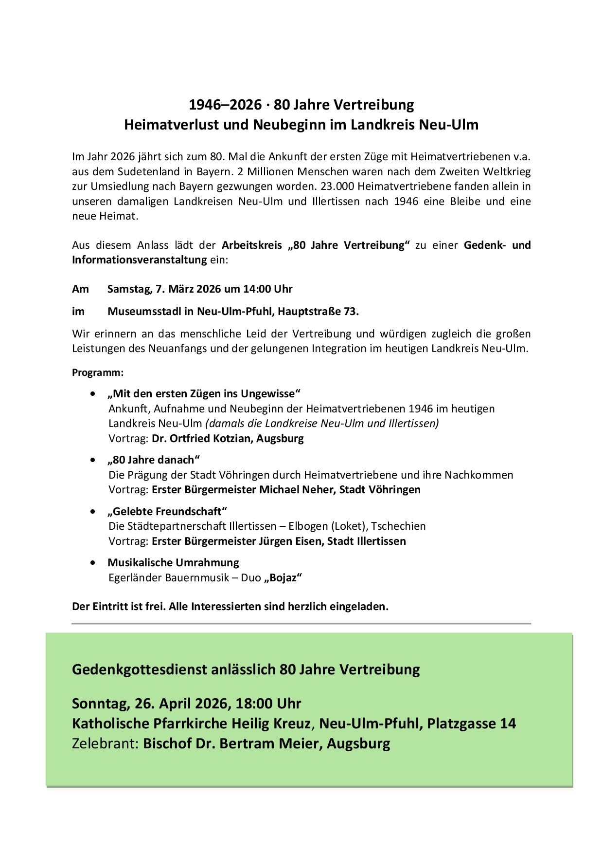 Gedenkgottesdienst anl. 80 Jahre Vertreibung mit Bischof Betram – in Pfuhl Wann So.. 26.04.2026 18:00 – 19:30 Zum Kalender hinzufügen ICS herunterladen Google Kalender iCalendar Office 365 Outlook Live Wo Hl. Kreuz Platzgasse 14, Neu-Ulm/Pfuhl, 89233
