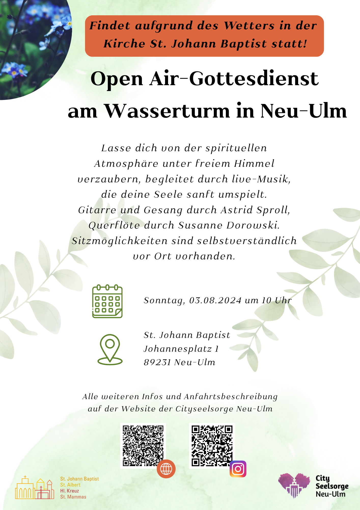 Gottesdienst mit GeistReich Wann So.. 03.08.2025 10:00 – 11:00 Zum Kalender hinzufügen ICS herunterladen Google Kalender iCalendar Office 365 Outlook Live Wo St. Johann Baptist Johannesplatz 1, Neu-Ulm, Bayern, 89231