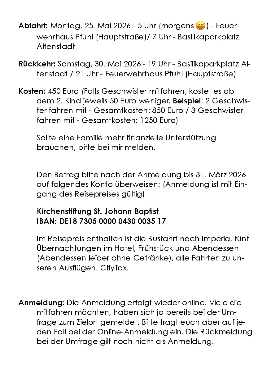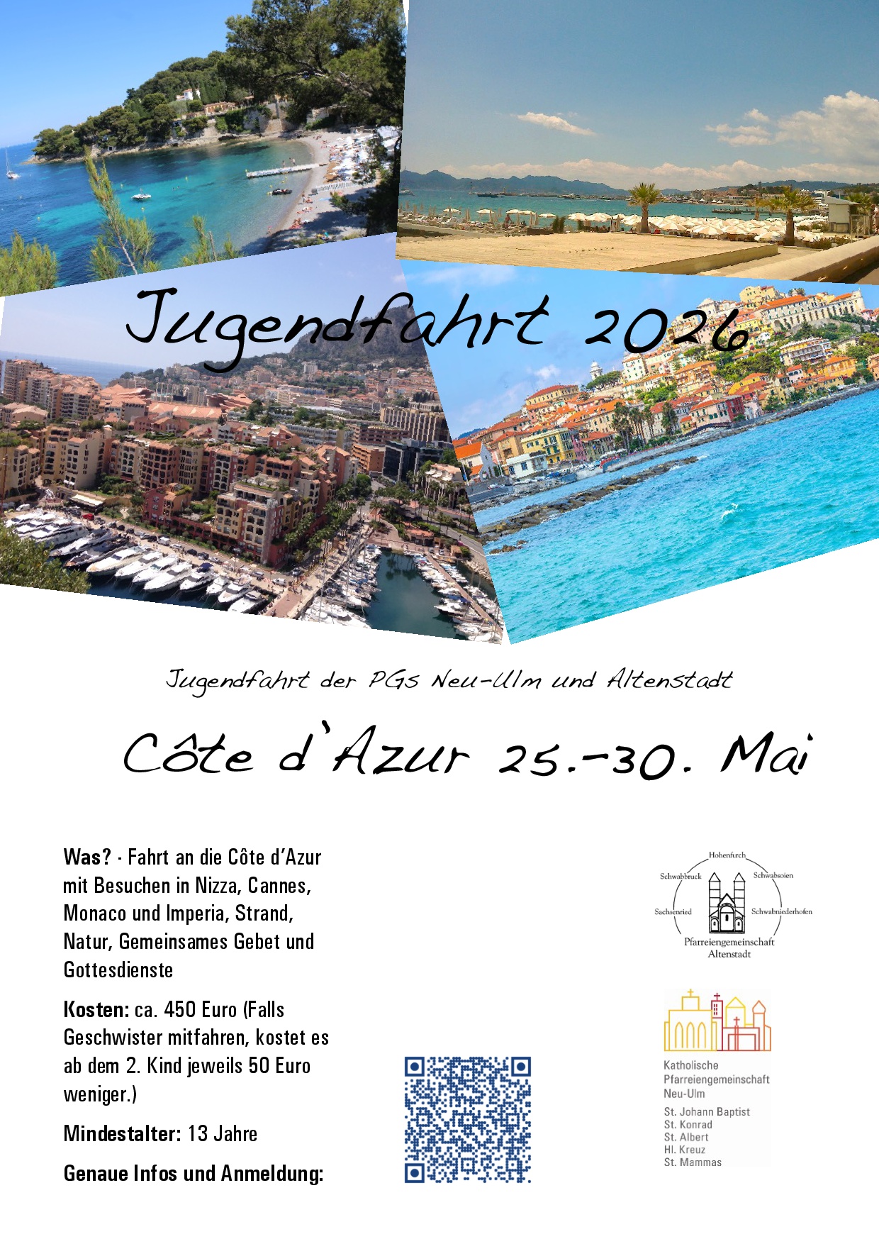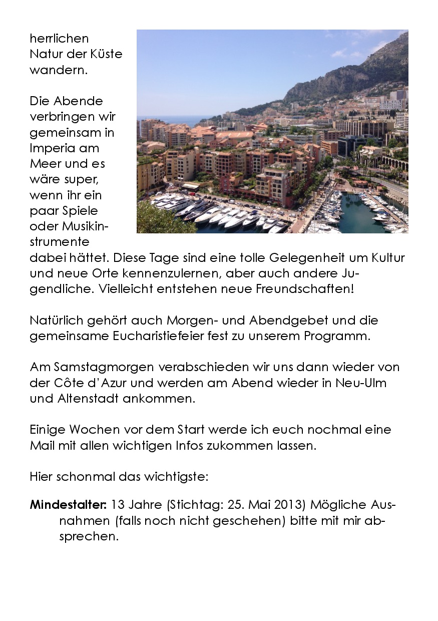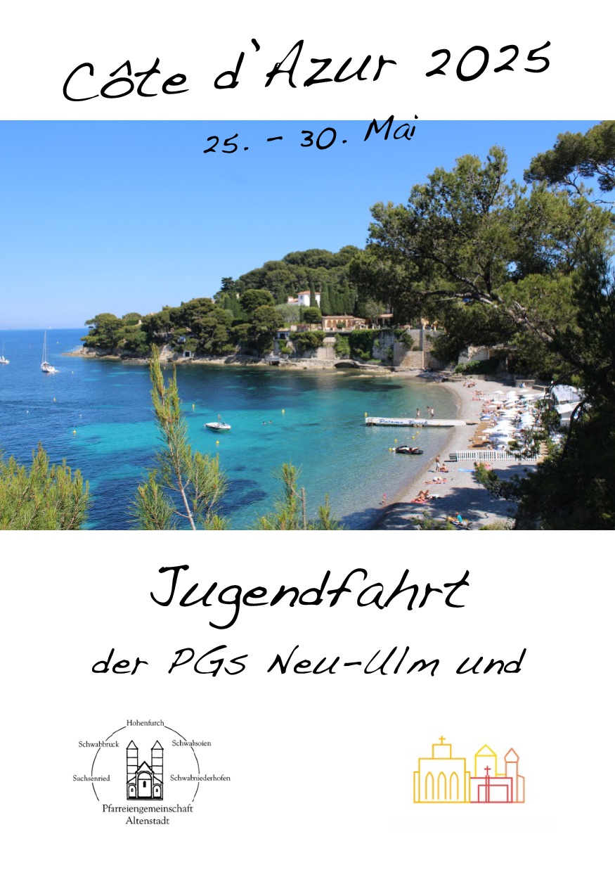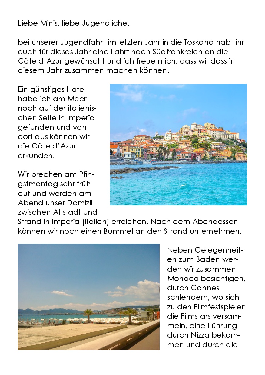 Jugendfahrt 2026: Cote d´Azur – bitte anmelden Wann Mo.. 25.05.2026 Ganztägig Zum Kalender hinzufügen ICS herunterladen Google Kalender iCalendar Office 365 Outlook Live Zum Öffnen der ganzen PDF-Datei bitte eines der Bilder anklicken.