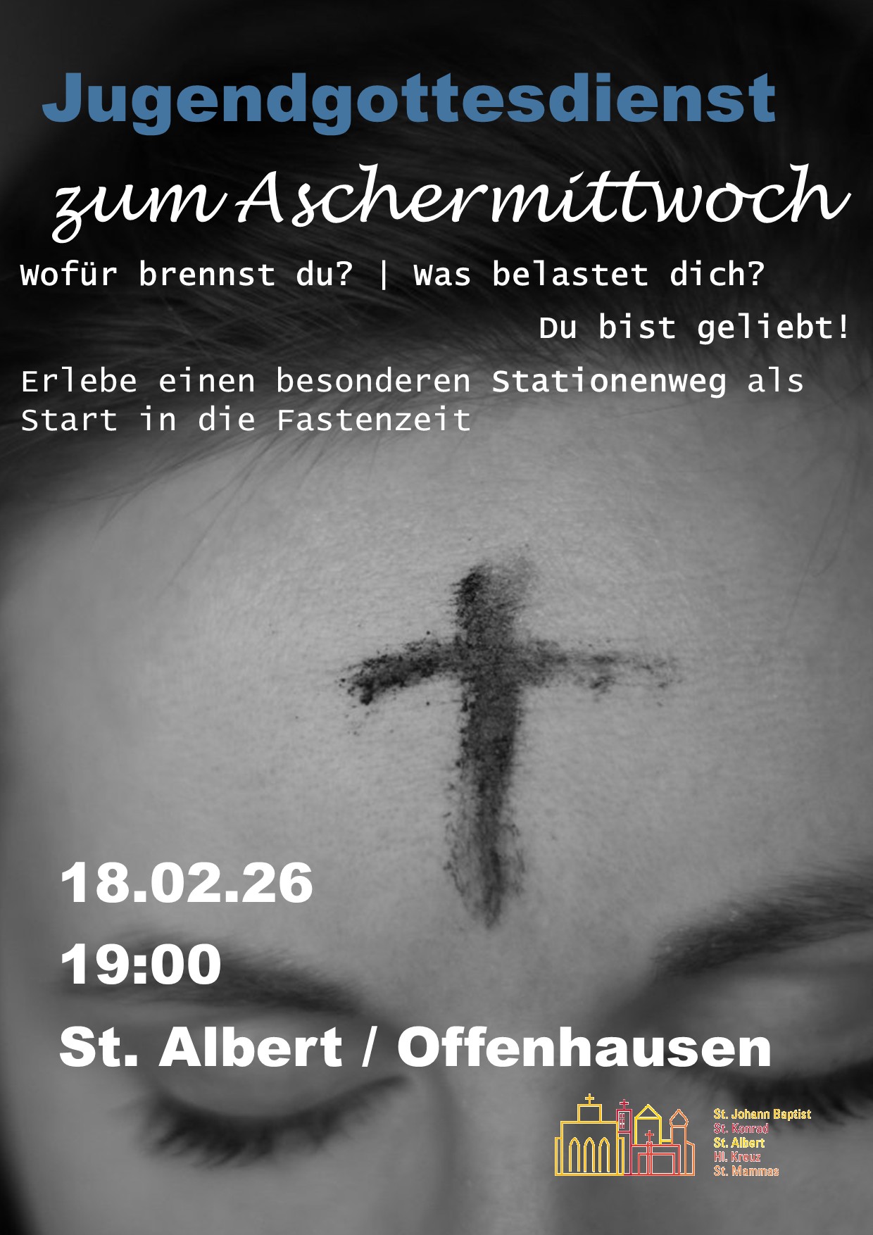 Jugendgottesdienst zum Aschermittwoch in St. Albert Wann Mi.. 18.02.2026 19:00 – 20:00 Zum Kalender hinzufügen ICS herunterladen Google Kalender iCalendar Office 365 Outlook Live Wo St. Albert Goethestraße 5, Neu-Ulm/Offenhausen, 89231
