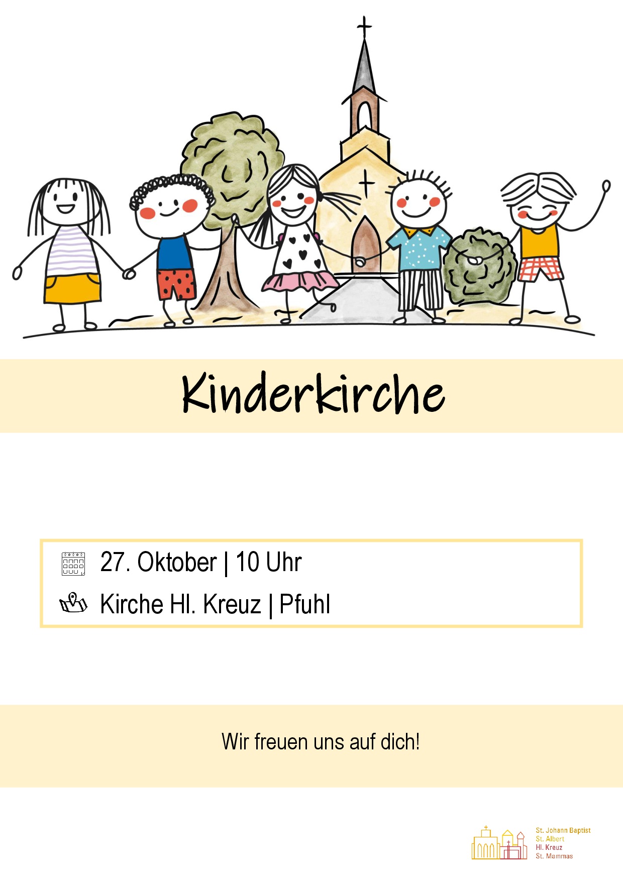 Kinderkirche in Pfuhl Wann So.. 27.10.2024 10:00 – 11:00 Zum Kalender hinzufügen ICS herunterladen Google Kalender iCalendar Office 365 Outlook Live Wo Hl. Kreuz Platzgasse 14, Neu-Ulm/Pfuhl, 89233