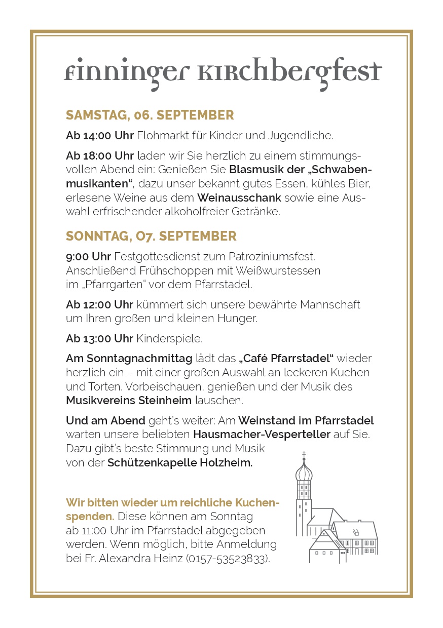 Das Kirchbergfest rund um den Pfarrstadel in Finningen findet dieses Jahr am 06.09. und 07.09.25 statt. Es beginnt am Samstag um 14 Uhr mit dem Kinderflohmarkt. Um 18 Uhr ist Fassanstich.