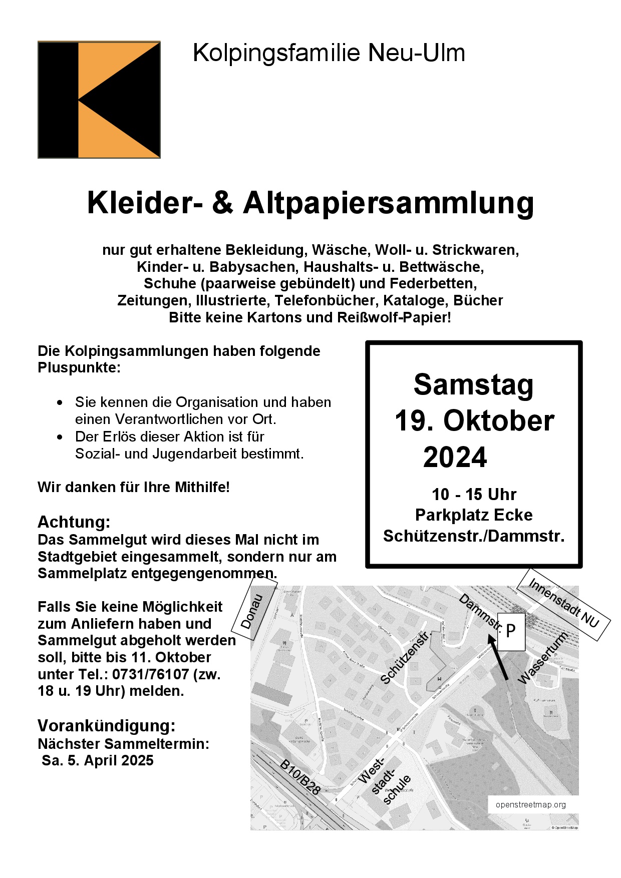 Kolping Kleidung- und Altpapiersammlung Wann Sa.. 19.10.2024 10:00 – 15:00 Zum Kalender hinzufügen ICS herunterladen Google Kalender iCalendar Office 365 Outlook Live