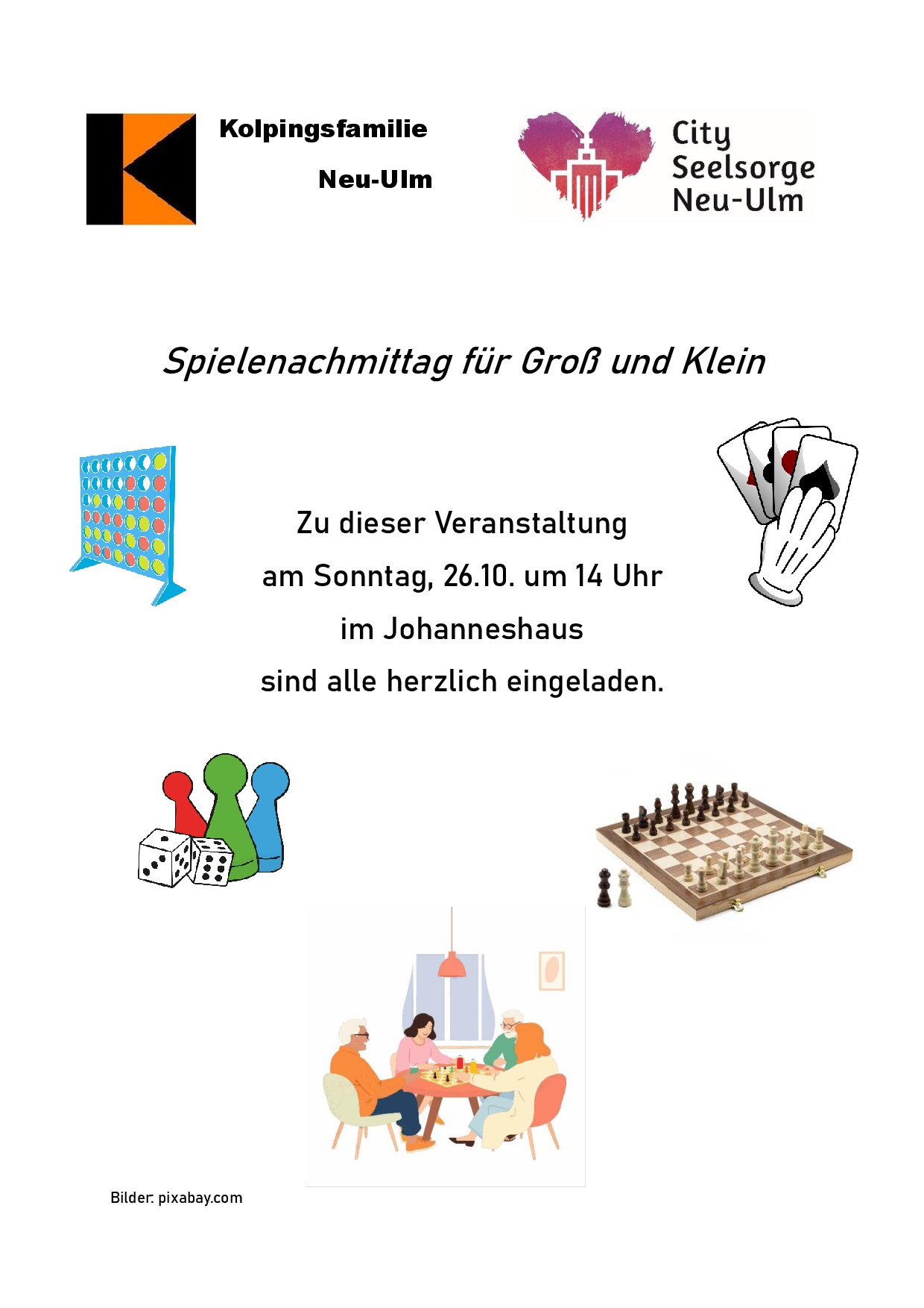Kolping NU/Cityseelsorge: Spielenachmittag Wann So.. 26.10.2025 14:00 – 16:00 Zum Kalender hinzufügen ICS herunterladen Google Kalender iCalendar Office 365 Outlook Live Wo Johanneshaus Johannesplatz 4, Neu-Ulm, Bayern, 89231 siehe auch: https://www.cityseelsorge-neu-ulm.de/ Kolpingsfamilie Neu-Ulm (PDF öffnen)