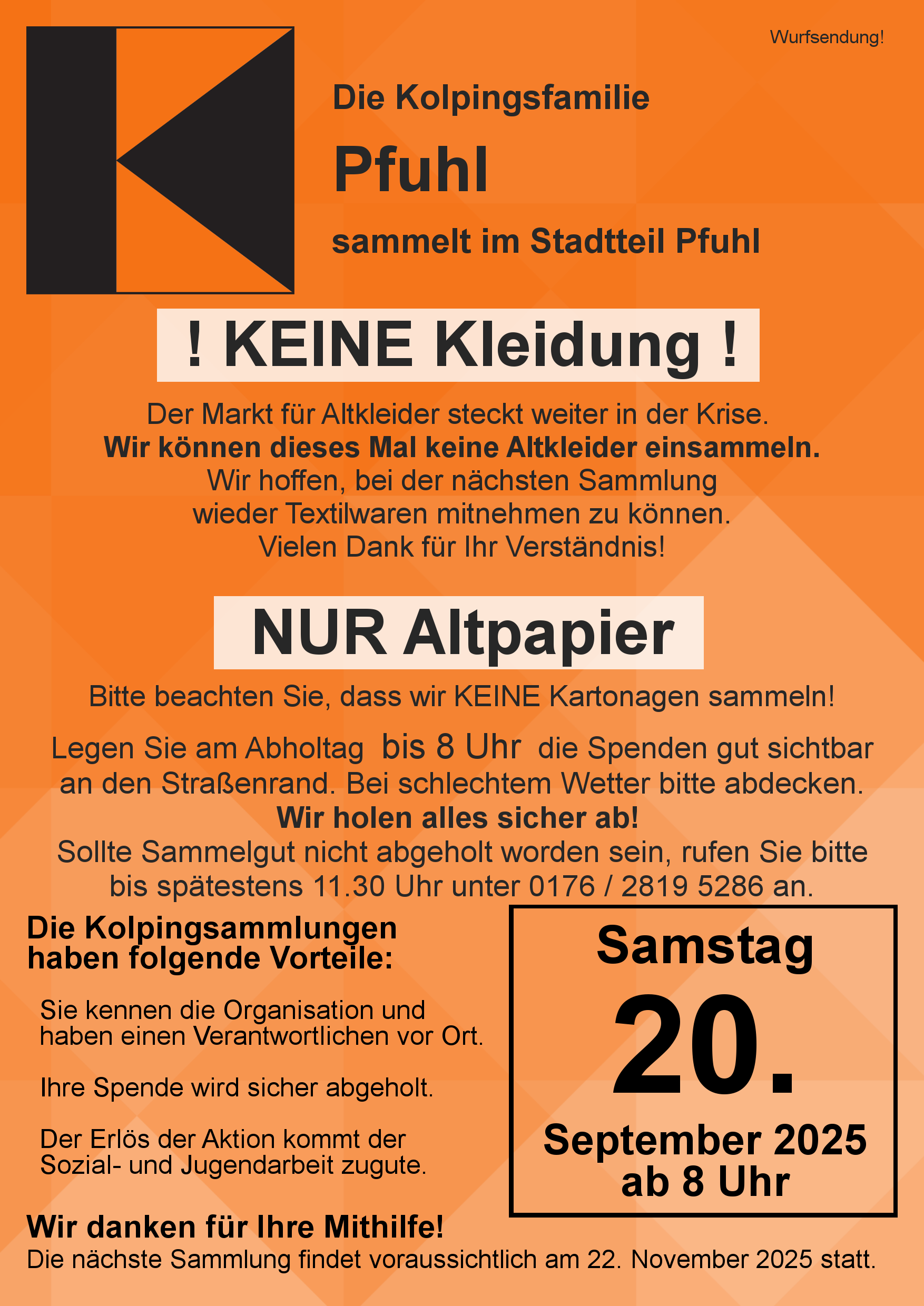Kolping Pfuhl: Altpapiersammlung Wann Sa.. 20.09.2025 08:00 – 12:00 Zum Kalender hinzufügen ICS herunterladen Google Kalender iCalendar Office 365 Outlook Live Die Kolpingsfamilie Pfuhl sammelt Altpapier in Pfuhl am Samstag, 20. September 2025 ab 8 Uhr.