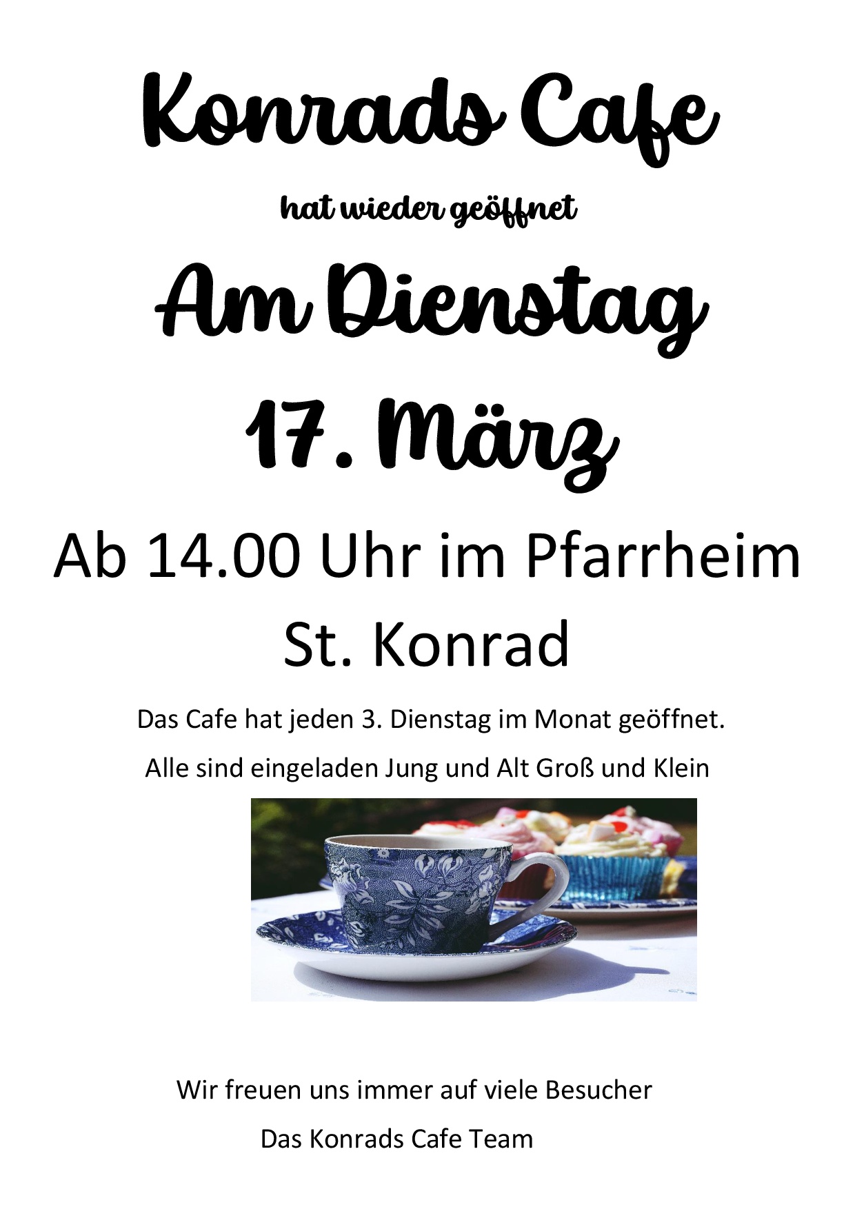 Das Konrads-Cafe ist immer am 3. Dienstag im Monat geöffnet ab 14.00 Uhr im Pfarrheim St. Konrad.