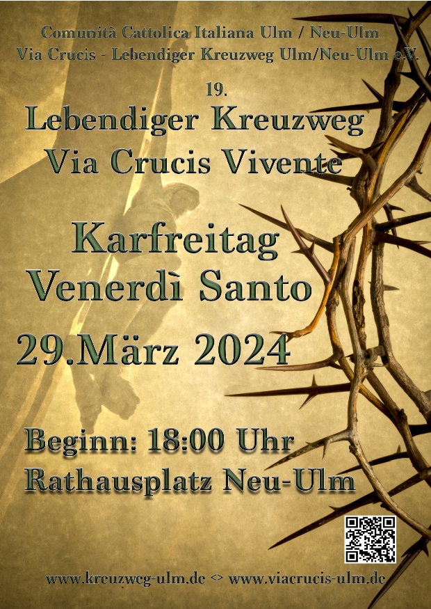 Lebendiger Kreuzweg d. ital. Gemeinde Wann Fr.. 29.03.2024 18:00 – 21:00 Zum Kalender hinzufügen ICS herunterladen Google Kalender iCalendar Office 365 Outlook Live