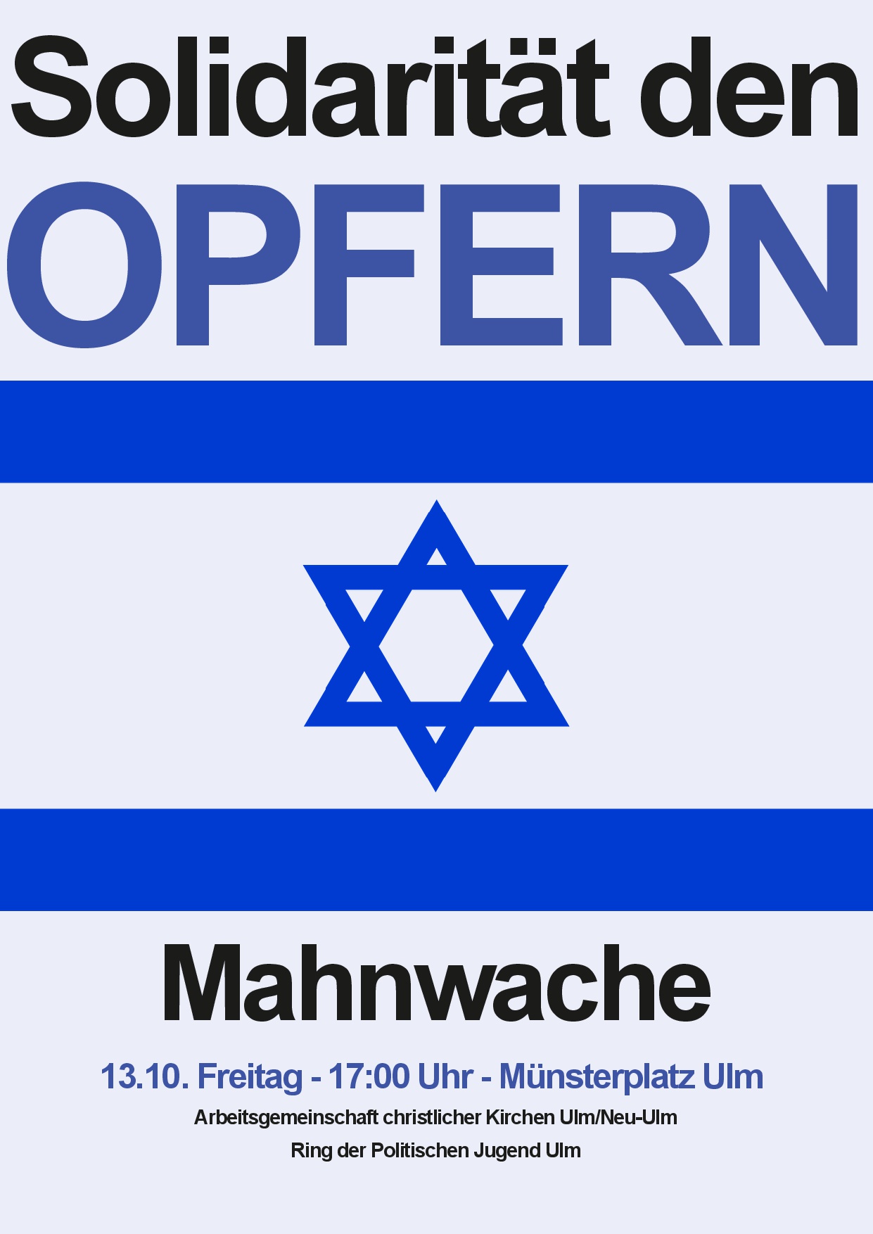 Am kommenden Freitag, dem 13. Oktober 2023, laden gemeinsam die „Arbeitsgemeinschaft Christlicher Kirchen Ulm / Neu-Ulm“ sowie der „Ring der Politischen Jugend Ulm“ zu einer Mahnwache um 17:00 Uhr auf den Münsterplatz ein.