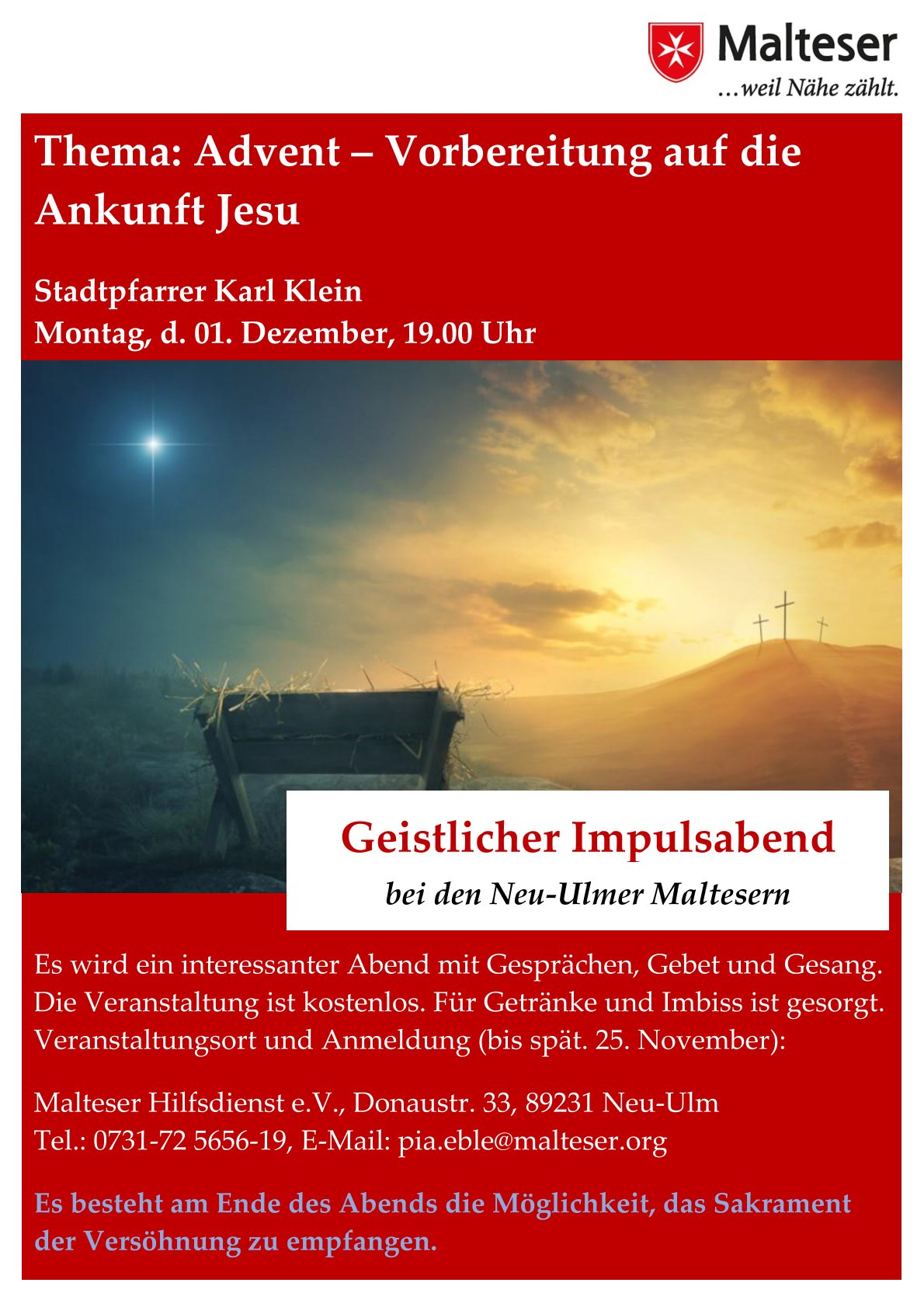 Wir freuen uns, dass unser Stadtpfarrer Karl Klein uns an diesem Abend einen Impuls zum Thema Advent geben wird. Es wird wieder ein interessanter Abend mit Gesprächen, Gebet und Gesang. Die Veranstaltung ist kostenlos. Für Getränke und Adventsknabbereien ist gesorgt. Es besteht am Ende des Abends die Möglichkeit, das Sakrament der Versöhnung zu empfangen.