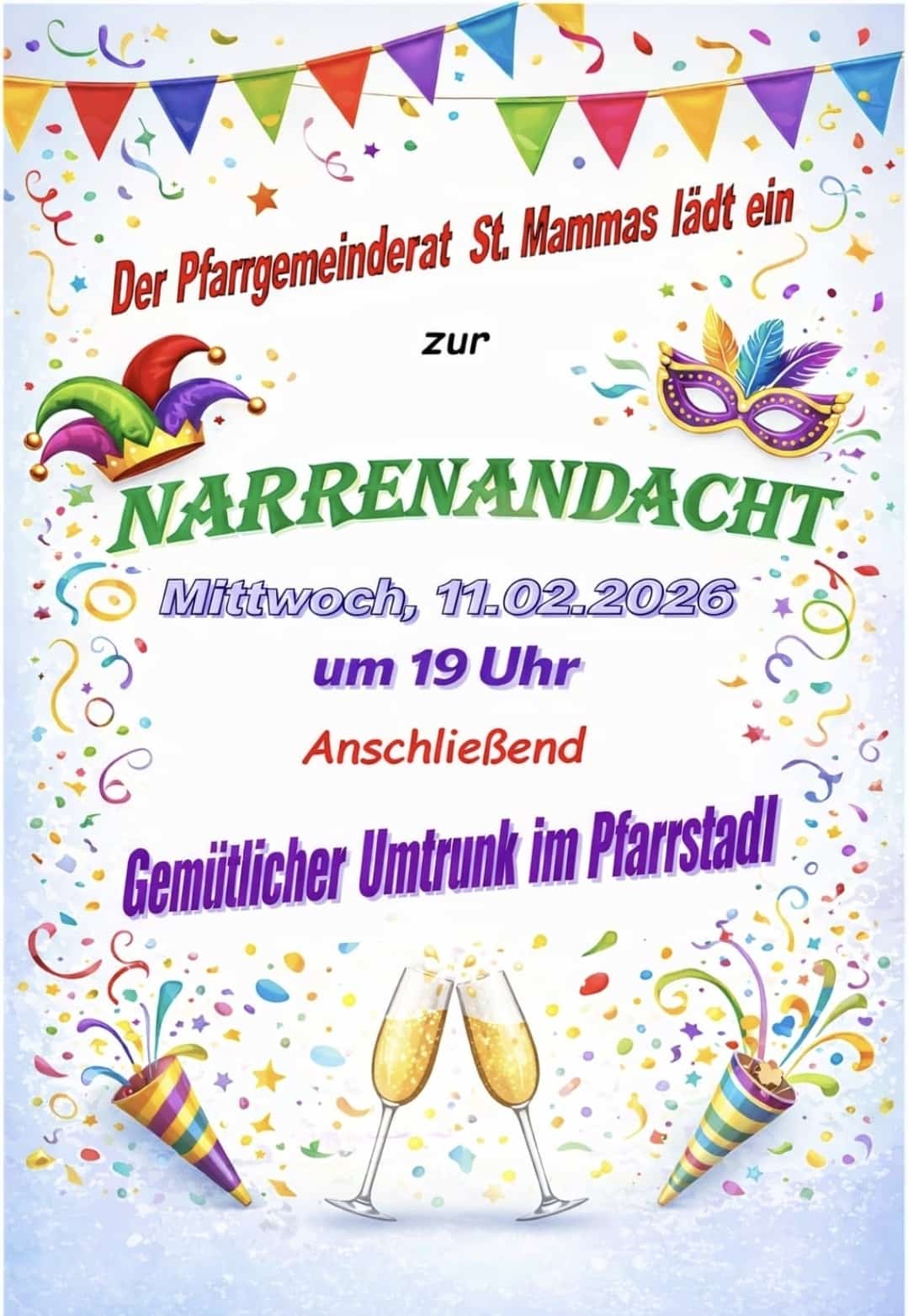 Narrenandacht in St. Mammas Wann Mi.. 11.02.2026 19:00 – 21:00 Zum Kalender hinzufügen ICS herunterladen Google Kalender iCalendar Office 365 Outlook Live Wo St. Mammas St.-Mammas-Weg 16, Neu-Ulm, 89233