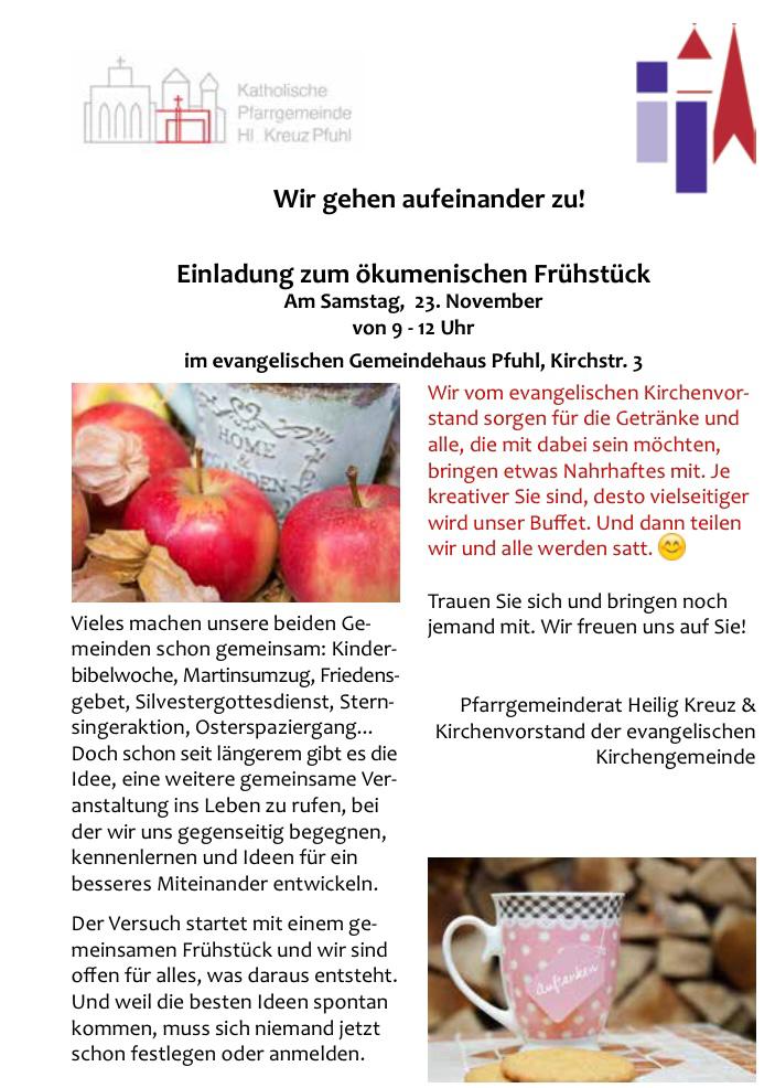 ökum. Frühstück in Pfuhl Wann Sa.. 23.11.2024 09:00 – 12:00 Zum Kalender hinzufügen ICS herunterladen Google Kalender iCalendar Office 365 Outlook Live Wo Evang. Gemeindehaus St. Ulrich Kirchstr. 3, Neu-Ulm/Pfuhl, 89233