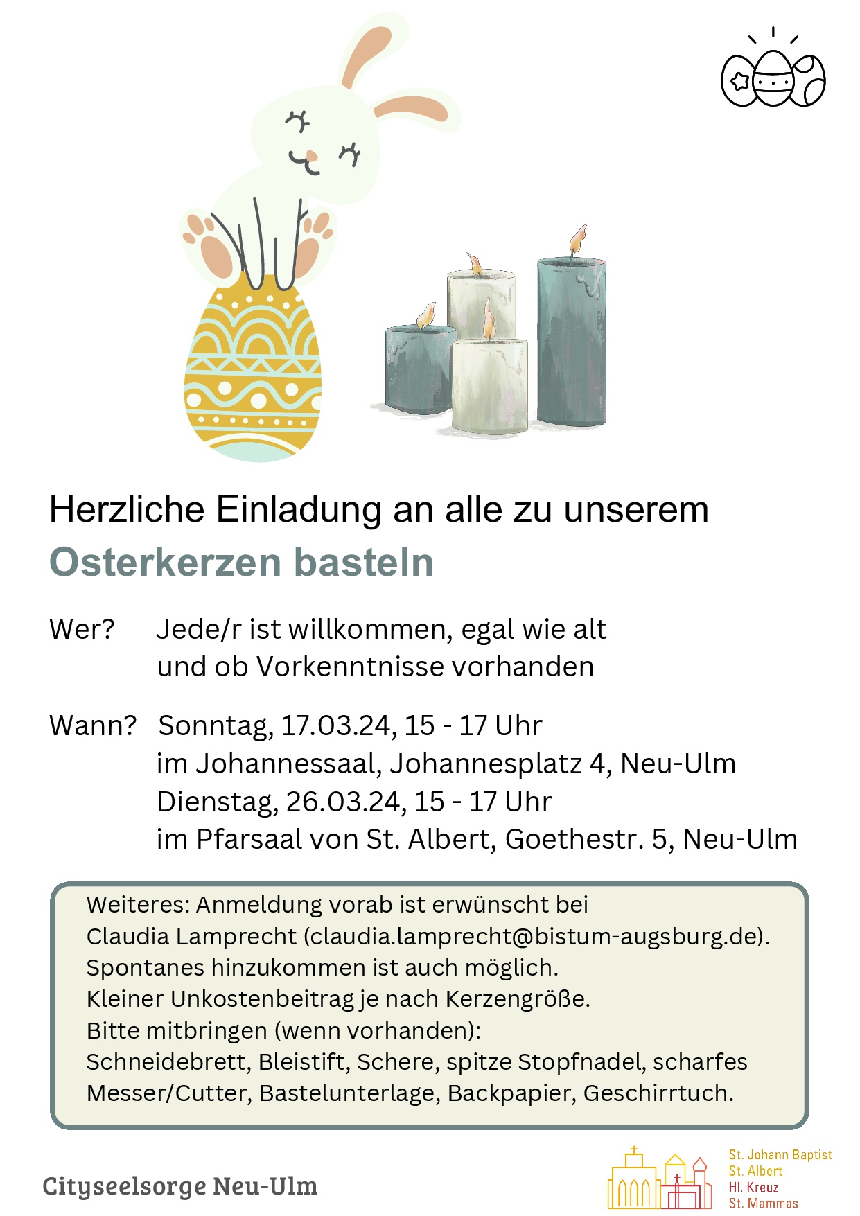 Osterkerzenbasteln für alle – bitte anmelden! Wann Di.. 26.03.2024 15:00 – 17:00 Zum Kalender hinzufügen ICS herunterladen Google Kalender iCalendar Office 365 Outlook Live Wo St. Albert Goethestraße 5, Neu-Ulm/Offenhausen, 89231