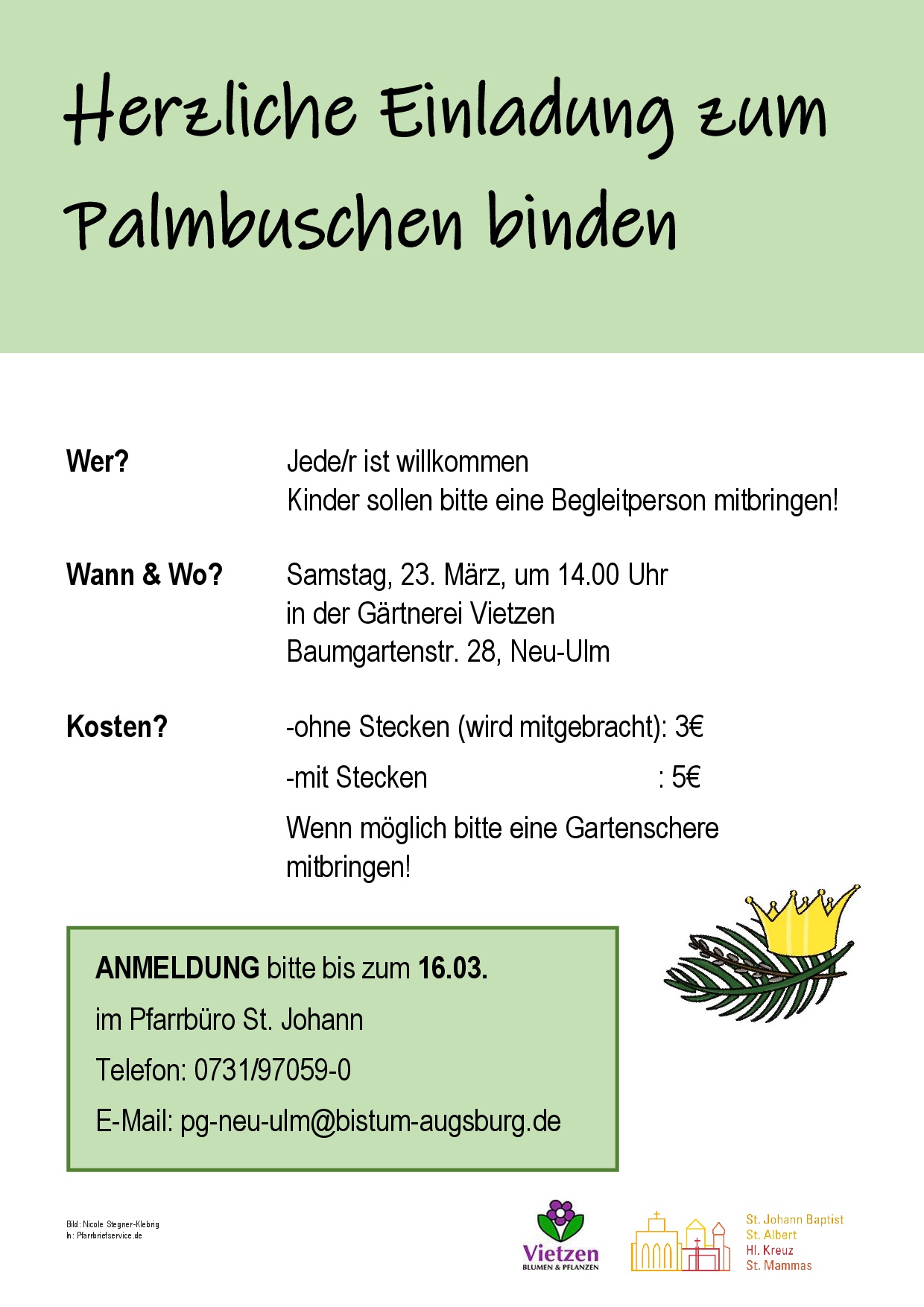 Palmbuschenbinden für Groß und Klein – bitte anmelden! Wann Sa.. 23.03.2024 14:00 – 16:00 Zum Kalender hinzufügen ICS herunterladen Google Kalender iCalendar Office 365 Outlook Live Wo Gärtnerei Vietzen Baumgartenstr. 28, Neu-Ulm, Bayern, 89231 E-Mail zur Anmeldung bitte mit Punkt, nicht mit Bindestrich: pg.neu-ulm@bistum-augsburg.de