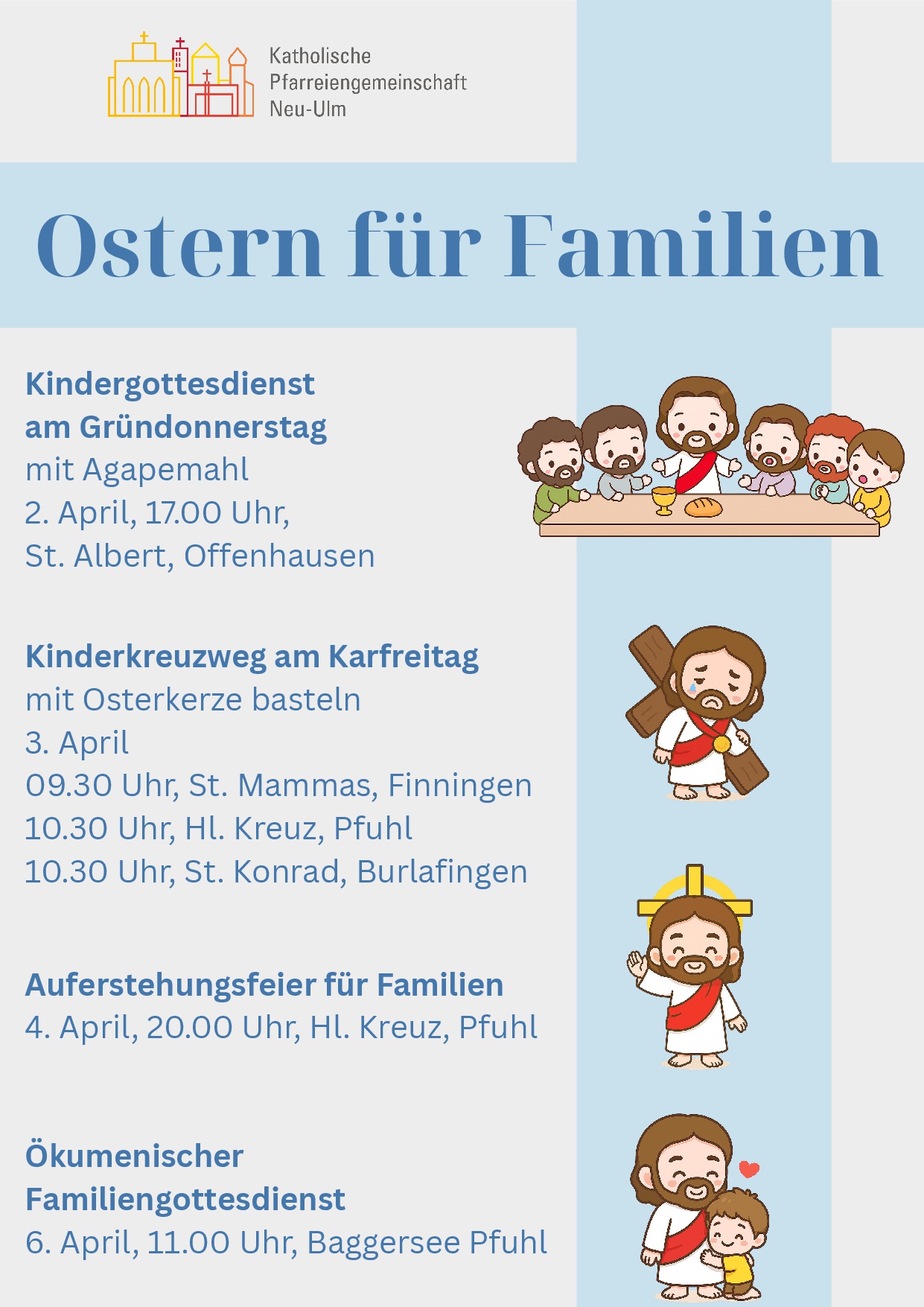 Fast jeden Sonntag findet in St. Johann Baptist, Neu-Ulm eine eigene Kinderkirche in der Krypta statt. Auch in Heilig Kreuz, Pfuhl und in St. Mammas, Finningen gibt es regelmäßig Kindergottesdienste. Im Sommer bieten wir auch Kinderkirche im Freien an.