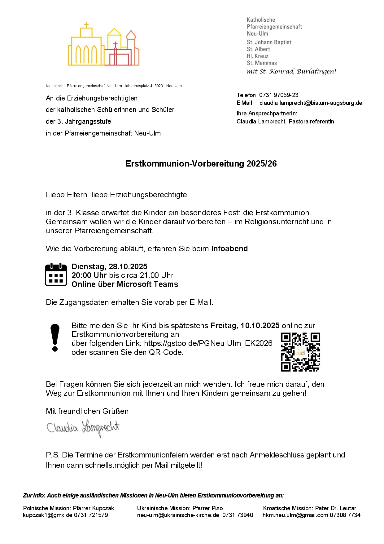 Kinder, die der Pfarreiengemeinschaft Neu-Ulm angehören, aber die dritte Jahrgangsstufe an einer anderen Grundschule besuchen, mögen bitte zu Beginn des Schuljahres mit dem Pfarramt Kontakt aufnehmen.